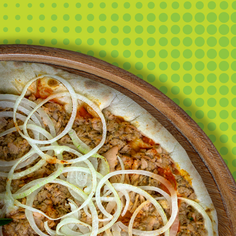 massa de fermentação lenta, molho de tomate temperado, atum sólido temperado, cebola, azeitonas pretas e orégano.