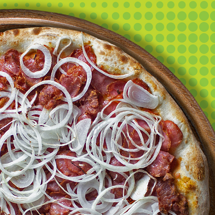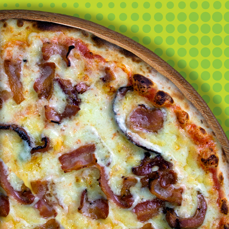 massa de fermentação lenta, molho de tomate temperado, mussarela, bacon fritinho e picadinho, azeitonas pretas e orégano.