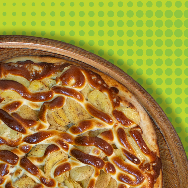deliciosa massa folhada, banana picada, coberta com faixas de chocolate branco e leve de toque de açúcar e canela.