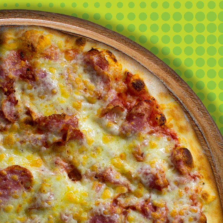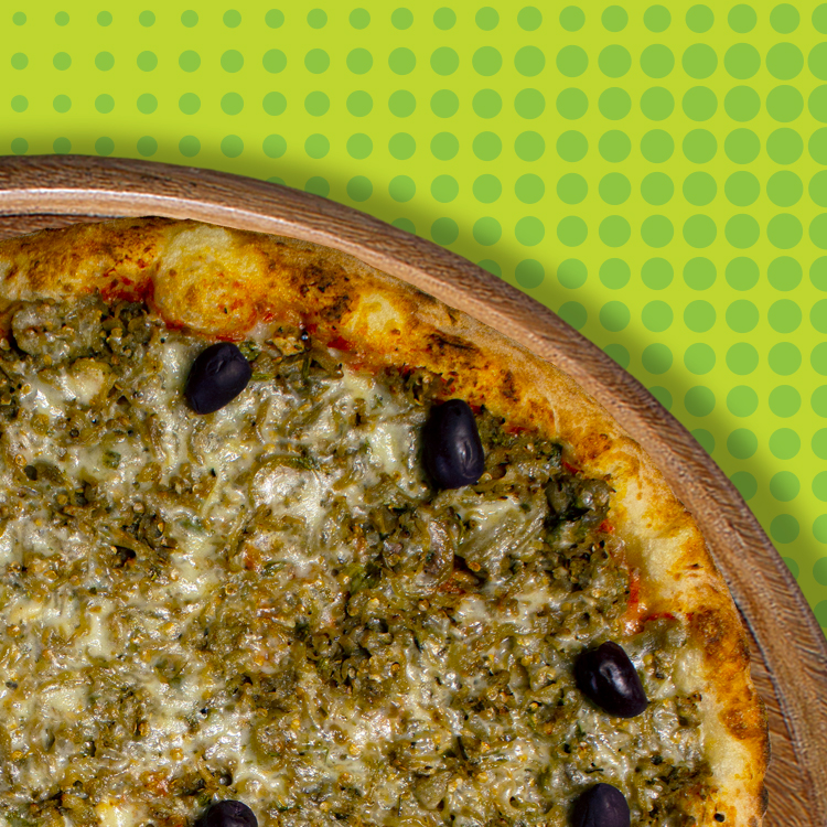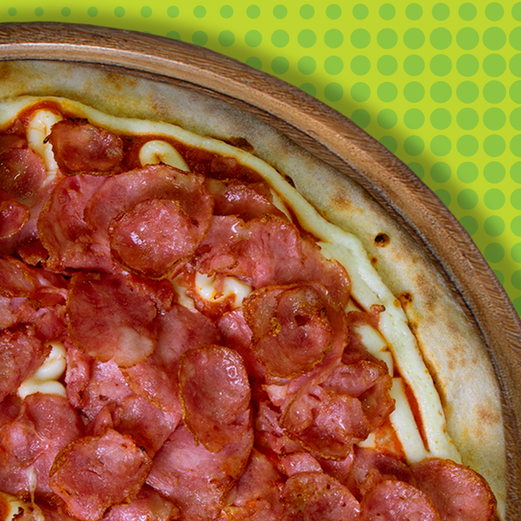 massa de fermentação lenta, molho de tomate temperado, mussarela gratinadinha, fatias de pepperoni, azeitonas pretas e orégano.