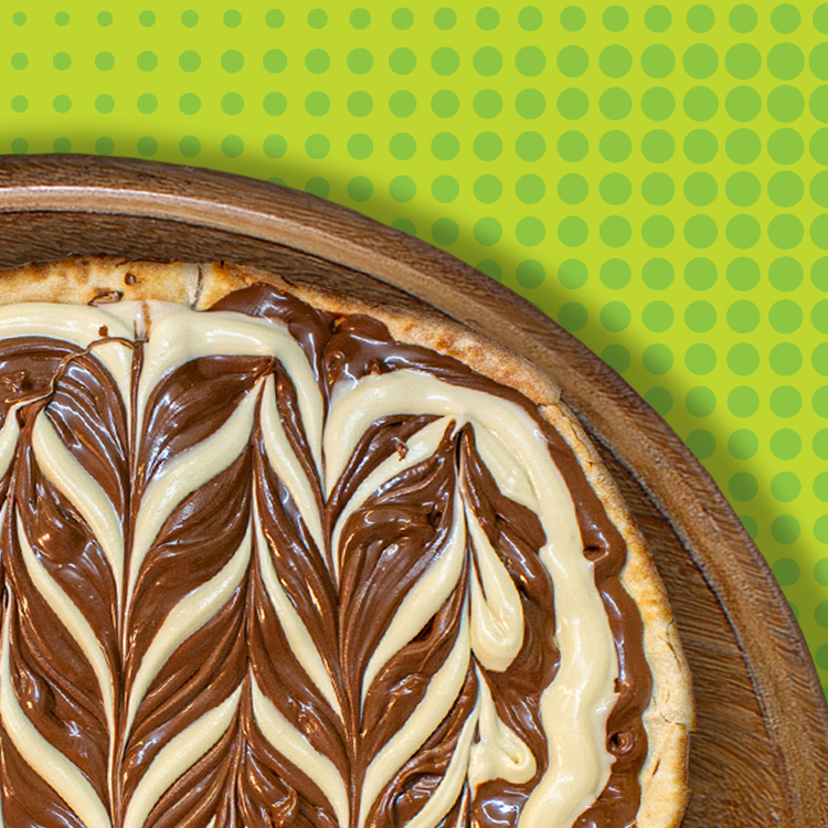 pizza pequena de 4 pedaços, deliciosa massa folhada, chocolate preto e branco.