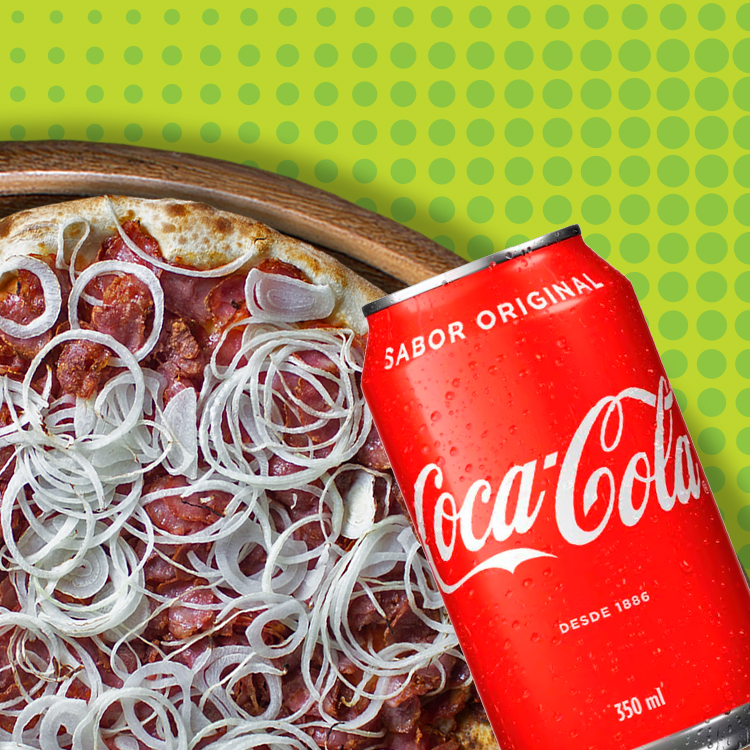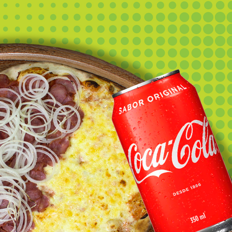 Deliciosa pizza tradicional de calabresa de 4 pedaços, do tamanho da sua fome e um refri latinha para acompanhar.