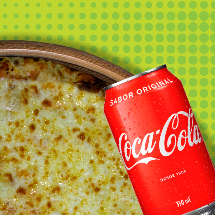 Deliciosa pizza tradicional de mussarela de 4 pedaços, do tamanho da sua fome e um refri latinha para acompanhar.