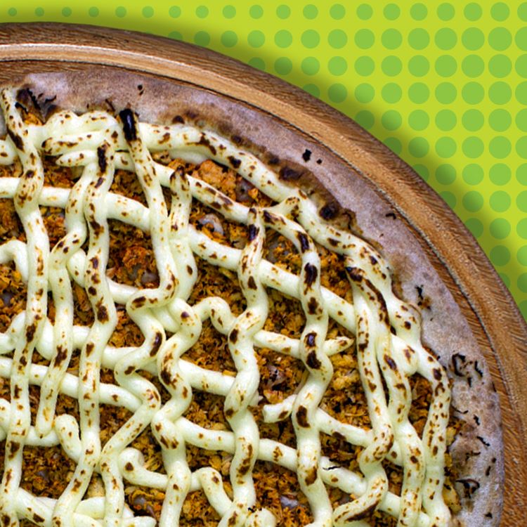 massa de fermentação lenta, molho de tomate temperado, molho de tomate temperado, peito de frango desfiado e temperado, cream cheese, bacon, azeitonas pretas e orégano.