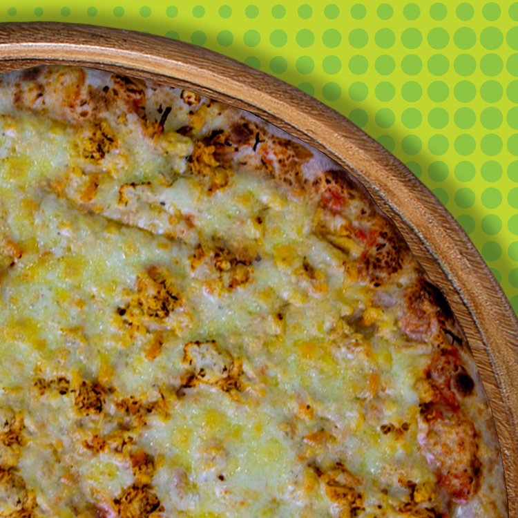 massa de fermentação lenta, molho de tomate temperado, molho de tomate temperado, peito de frango desfiado e temperado, cheddar, bacon, azeitonas pretas e orégano.