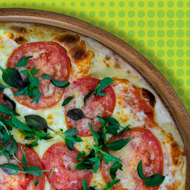 massa de fermentação lenta, molho de tomate temperado, mussarela gratinadinha, rodelas de tomate, manjericão fresco, parmesão salpicado, azeitonas pretas e orégano.