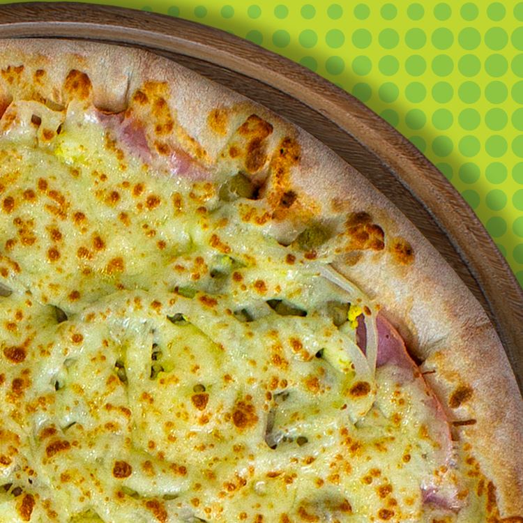 massa de fermentação lenta, molho de tomate temperado, mussarela gratinadinha, presunto picado, ovos cozidos picados, ervilha, cebola, azeitonas pretas e orégano.